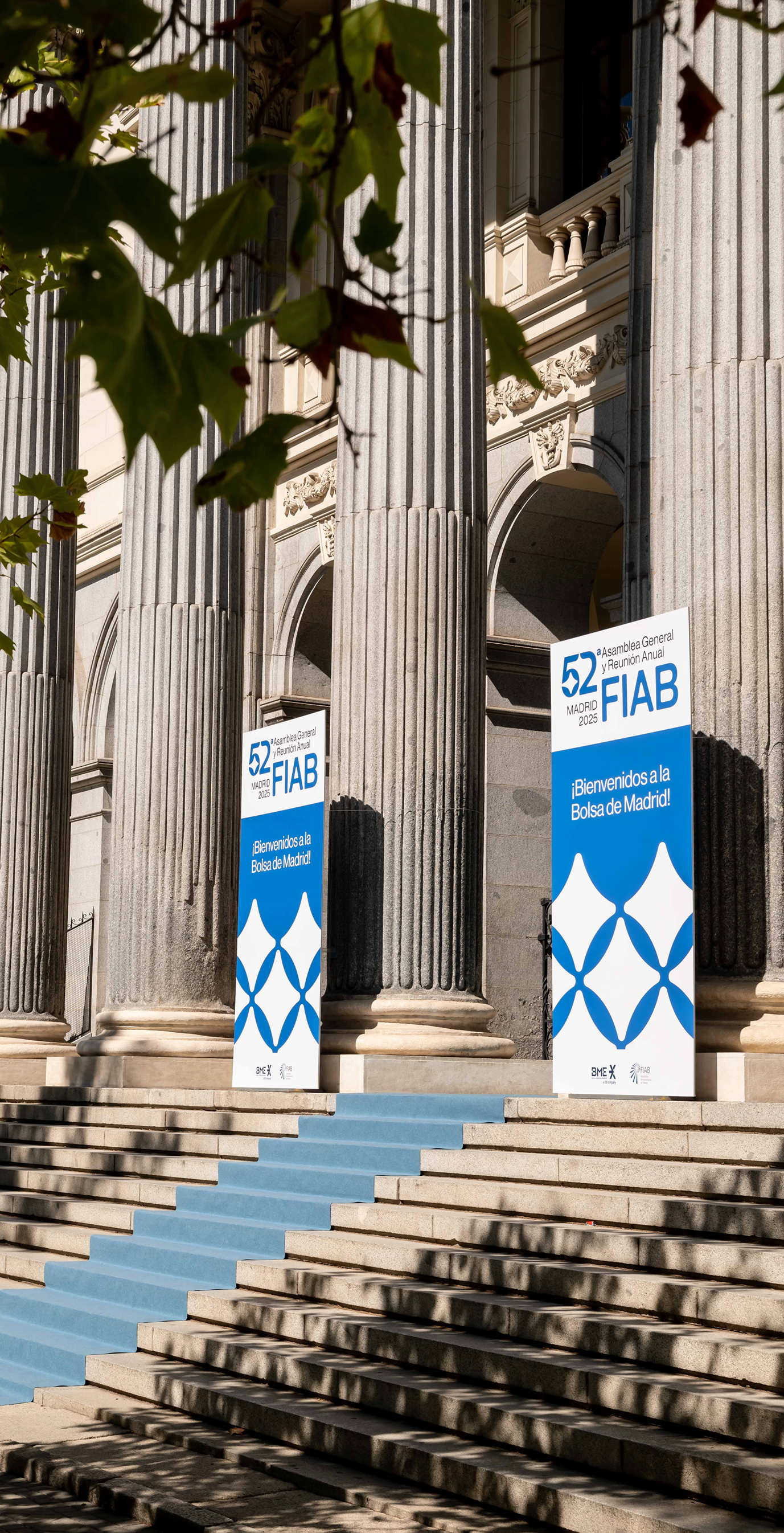 Design of the visual identity for the 52ª Asamblea FIAB, the annual meeting of the Federación Iberoamericana de Bolsas, held in 2025 in Madrid. Development of the visual system, applied across web, signage, digital assets, and all printed materials.